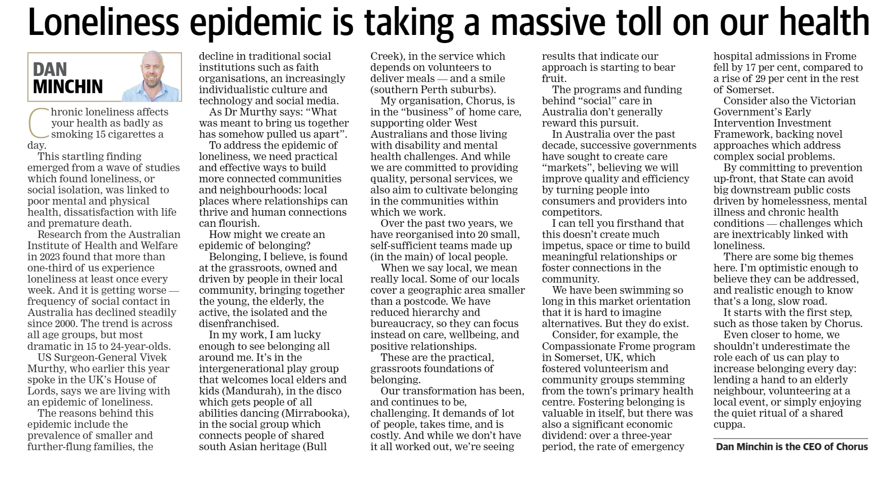 How might we create an epidemic of belonging? Chorus CEO, Dan Minchin speaks to creating practical and effective ways to build more connected communities and neighbourhoods in the West Australian on 3 July 2024. Click here to read more.